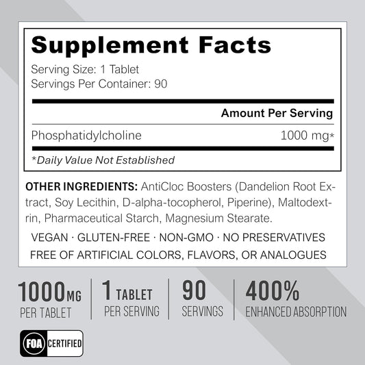 Premium Phosphatidylcholine PC 1000MG Tablets | 90 Day Supply | 5X Ultra Absorption | Max Strength | Supports Methylation & Epigenome | Anti-Aging | Brain & Liver Health