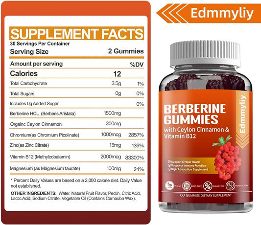 1500mg Berberine Gummies with Ceylon Cinnamon - Sugar Free Supplement (90 ct)