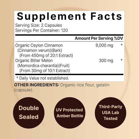Organic Ceylon Cinnamon & Bitter Melon Capsules - 9,000mg, 240 Count - Non-GMO & Gluten-Free - Sri Lanka Cinnamon