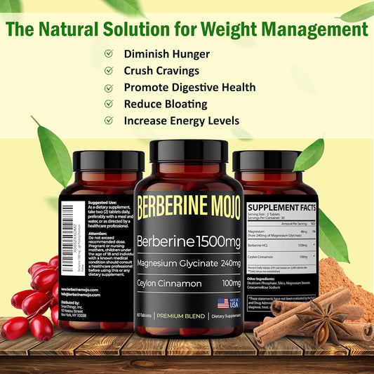 High Potency Berberine Supplement with Magnesium Glycinate & Ceylon Cinnamon for Weight Management & Gut Health - 60 Tablets, Made in USA