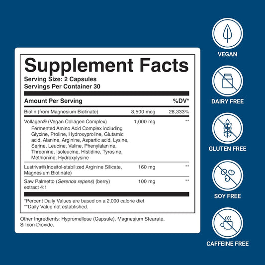 Plant-Based Collagen Complex with Biotin for Skin, Hair, & Muscle Support - Vegan Formula with Lustriva & Saw Palmetto (30 servings)