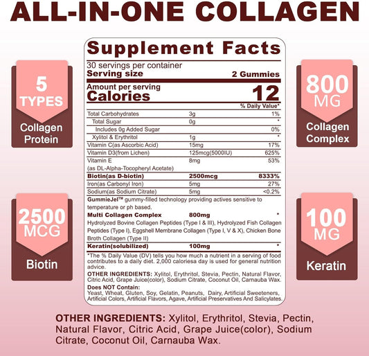 Hydrolyzed Collagen Peptides Gummies 800mg - Sugar Free, Multi Peptides Type I II III V & X with Biotin, Keratin & Vitamin for Healthy Skin, Hair, Nails, Bones & Joints - 2 Pack