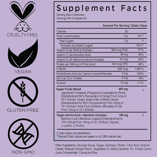 Honey Skincare Vegan Gummies for Radiant Skin, Hair, Nails, Wrinkle Support - 60 Count, Gluten Free, Non GMO, Citrus Flavor