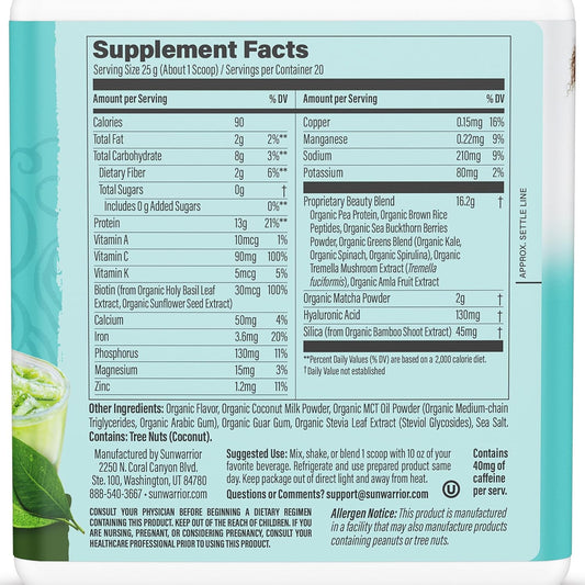 Plant-Based Protein Powder with Vegan Collagen Peptides, Hyaluronic Acid, and Biotin for Hair, Skin, and Nails - Coconut Matcha Latte Flavor - Non-GMO, Dairy & Sugar Free, Low Carb - 20 Servings