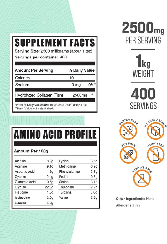 BulkSupplements.com Marine Collagen Peptides Powder - Hydrolyzed Collagen Supplement, Gluten Free - 2500mg per Serving, 1kg (2.2 lbs) Pack of 1