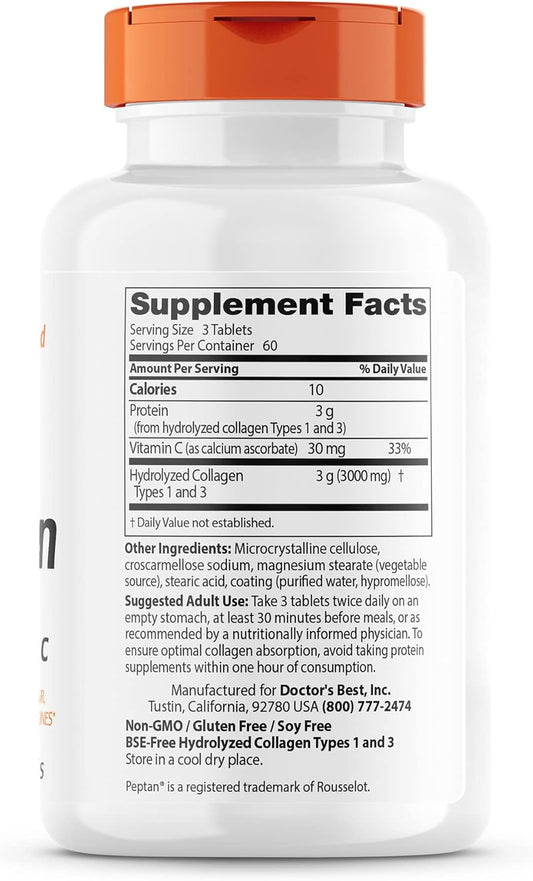 Doctor's Best Collagen Types 1 & 3 Peptan Tablets - Non-GMO, Gluten & Soy Free, 1000mg - Supports Hair, Skin, Nails, Tendons, and Bones - 180 Count