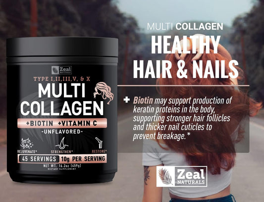Premium Multi Collagen Peptides Protein Powder with Vitamin C, Biotin, Hyaluronic Acid for Hair Skin and Nails - Marine, Bovine, Chicken & Eggshell - Unflavored (45 Servings)