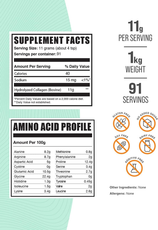 Hydrolyzed Bovine Collagen Peptides Powder - Gluten Free, 11g per Serving, 1kg (2.2 lbs) - Bulk Supplement Pack of 1