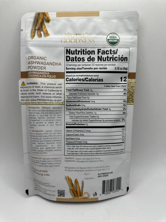 Organic Ashwagandha Powder - 22 Servings (4 oz) - Superfood Supplement from Nature's Goodness