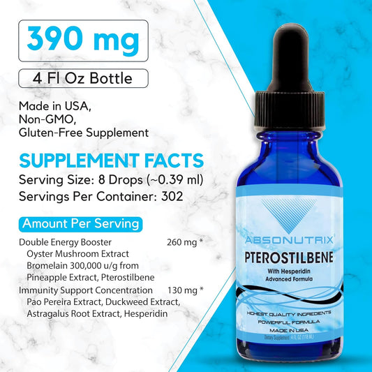 Premium Absonutrix Pterostilbene with Hesperidin Liquid - 390mg, 4oz - 300 Servings - USA Made - Fast Absorption - Non-GMO - GMP Certified - Cruelty-FreeVendor:AbsonutrixRegular price $149.08 AUDRegular priceUnit price / per-