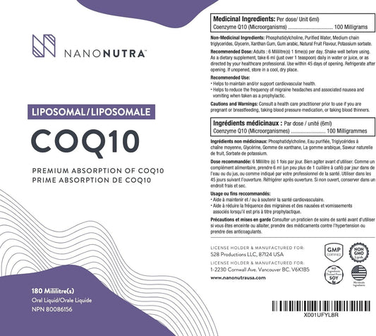 NanoNutra Liquid CoQ10 Supplement (100mg Ubiquinone) with Fast-Absorbing Liposome Technology | Non-GMO, Non-Soy | Boost Energy, Anti-Aging | 180ml/30 Servings