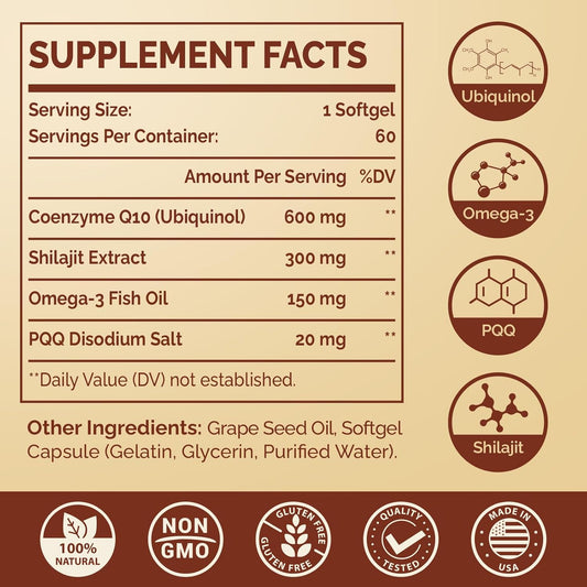 Ciaceae Ubiquinol CoQ10 Softgels - 600 MG with Omega-3, Shilajit, PQQ - Advanced Dual-Delivery Coenzyme-Q10 - Active CoQ10 Ubiquinol Supplement - Fertility, Antioxidant, Heart, Brain, Energy - 180 ServingsVendor:CiaceaeRegular price $155.81 AUDRegular priceUnit price / per-