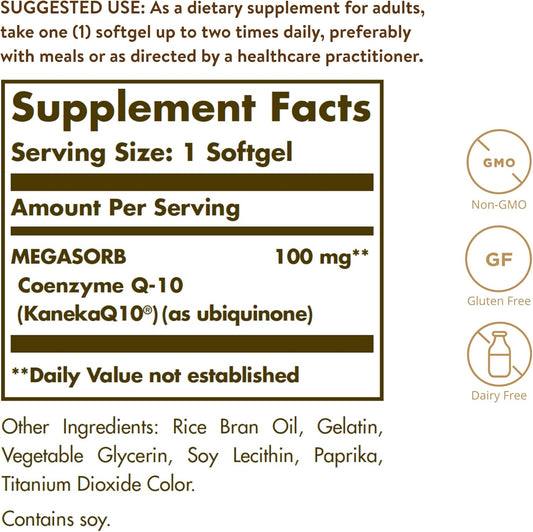 Solgar Megasorb CoQ-10 100 mg Softgels - Heart Health & Anti-Aging Support - High Absorption Coenzyme Q10 Supplement - Non-GMO, Gluten & Dairy Free - 90 Servings
