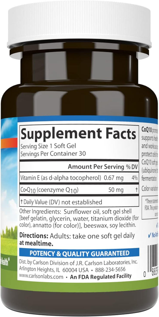 Carlson Co-Q10 50mg Softgels for Energy Production and Heart Health - 30 Count