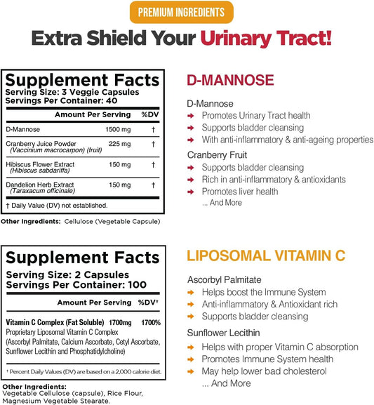 Ultimate Urinary Tract Health Bundle with D-Mannose, Liposomal Vitamin C, Cranberry - Enhanced Absorption, Detox Support - Dietary Supplement