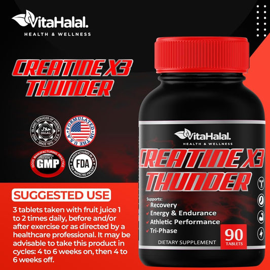 Halal Certified Creatine Monohydrate Pills for Enhanced Performance and Muscle Growth - VitaHalal Creatine X3 Thunder