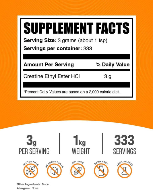 BulkSupplements.com Creatine Ethyl Ester HCl Powder - Unflavored & Gluten Free - 1kg - 3g per Serving - Pack of 1Vendor:BulkSupplementsRegular price $192.48 AUDRegular priceUnit price / per
