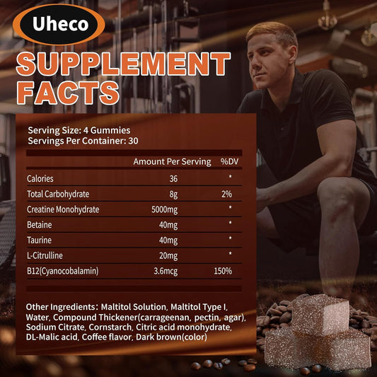 Uheco Coffee Flavor Creatine Gummies 5000mg with L-Taurine, Vitamin B12, Betaine, L-Citrulline - Muscle Strength and Endurance Support for Men and Women - 115 Count