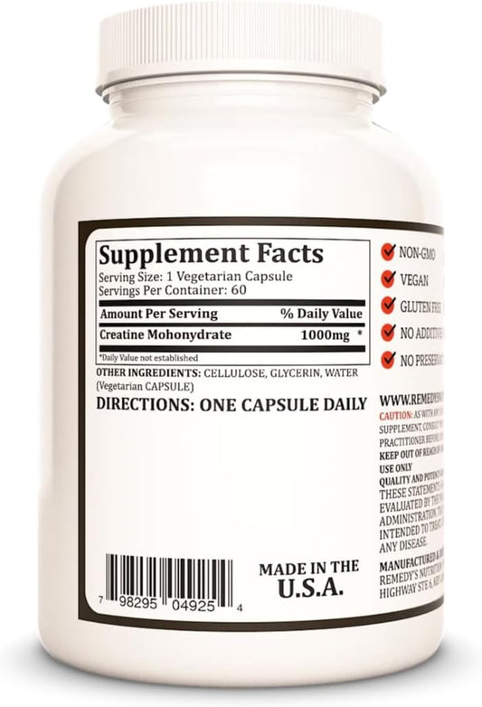 1000mg Creatine Monohydrate Vegan Capsules - 60 Count | Non-GMO, Gluten & Dairy Free Dietary Supplement