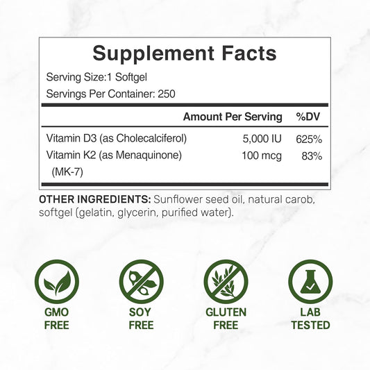 2-Pack Vitamin D3 K2 Softgel Bundle, 5000 IU D3 & K2 MK7 Complex, 250 Count, Promotes Heart, Bone, Teeth Health - Easy to Swallow