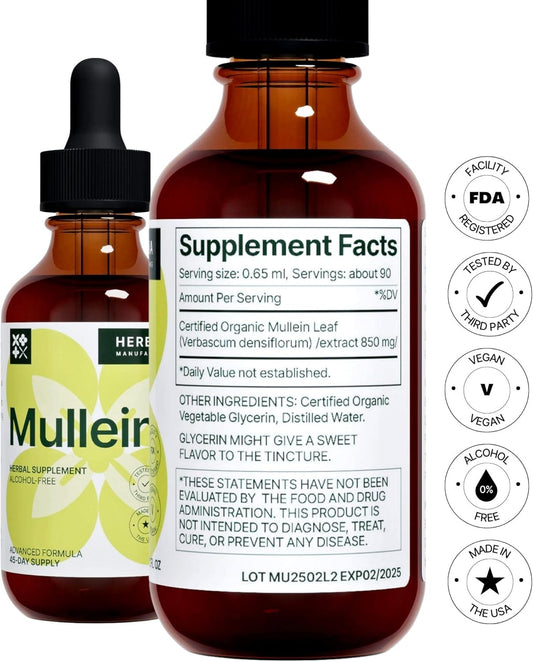 Herbana Manufacturing Mullein Leaf Liquid Extract - Natural Lung Cleanse & Detox Supplement - Respiratory Health and Immune Support Tincture - High Potency Drops - 45-Day Supply