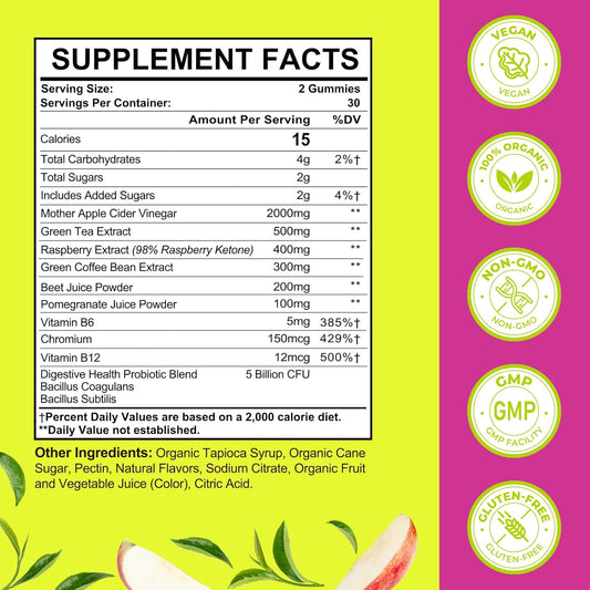 Max Strength Apple Cider Vinegar Gummies with Green Tea & B12 - 60 Vegan Keto Gummies for Detox Cleanse & Metabolism Support