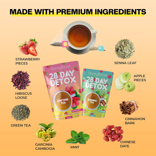 SkinnyBoost 28 Day Detox Tea Kit: Daytime Hibiscus & Evening Apple Cinnamon - Non-GMO, Vegan, All Natural Tea for Bloating Reduction