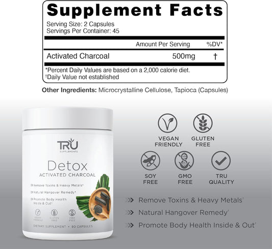 TRU Detox Activated Charcoal Supplement - Vegan Friendly, Whole Body Natural Detox, Reduce Bloating, Enhance Skin Health - 60 Servings