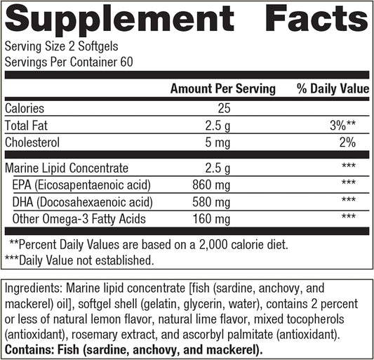 High Potency Wild Caught Omega 3 Fish Oil Softgels with Lemon Flavor - 120 Softgels, 4080mg - EPA 1200mg, DHA 900mg - Burpless