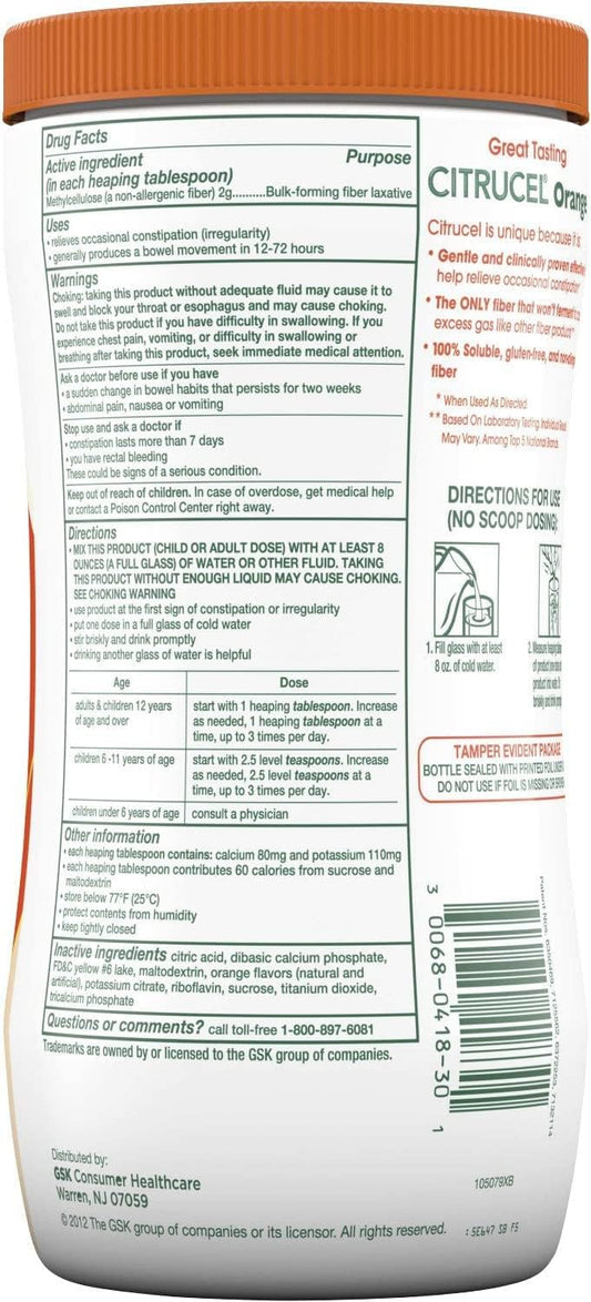 Bulk Pack of 3 Citrucel Orange Flavor Fiber Therapy Powder - 30 oz Each - Relieves Occasional Constipation