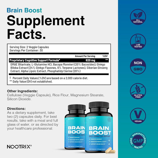 Nootropics Brain Supplements for Memory & Focus with Huperzine A, Phosphatidylserine, DMAE - Brain Health Support: GABA, Choline, DHA, Bacopa Monnieri - 60 Capsules