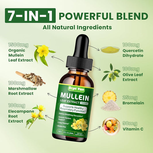 Organic Mullein Leaf Extract Liquid for Lung Health - 1500mg Herbal Supplement for Detox & Respiratory Support - Vegan, 2 Fl Oz