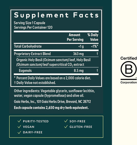 Gaia Herbs Holy Basil Leaf Liquid Phyto-Capsules - Ayurvedic Adaptogen for Stress Balance - 120 Capsules