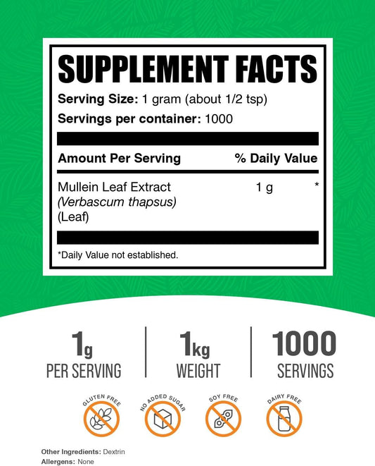 BulkSupplements.com Mullein Leaf Extract - 1000mg Herbal Supplement for Immune Support - Gluten Free - 1kg (2.2 lbs) Pack