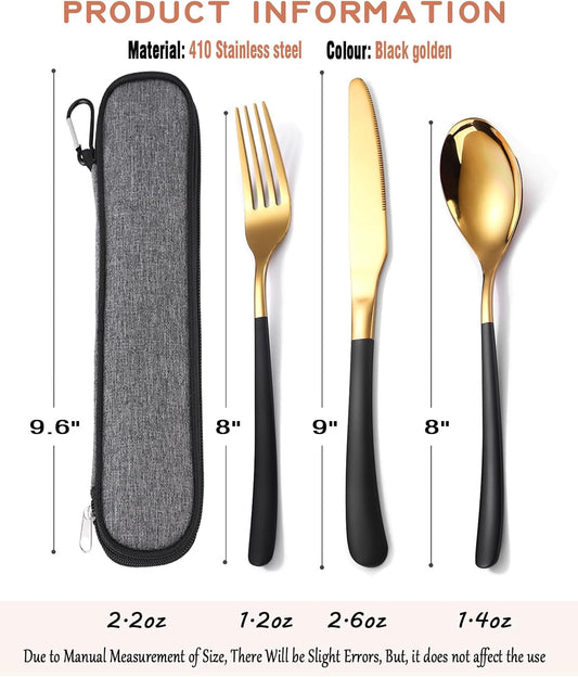 3-Piece Stainless Steel Cutlery Set with Case - Reusable Flatware for Work - Knife, Fork, Spoon - Black Gold Finish