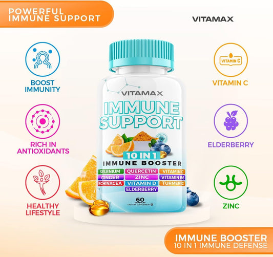 10-in-1 Immune Support Booster with Elderberry, D3, Selenium, Quercetin, Zinc, Vitamin C, Ginger, Turmeric Curcumin, B6, Echinacea - Natural Defense - USA-Made (60 Count)
