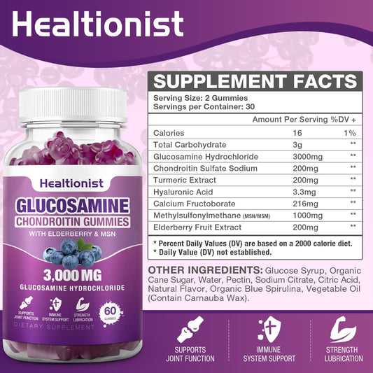 2 Packs Healtionist Glucosamine Chondroitin Gummies 3000mg with MSM & Elderberry - Joint Health Supplement for Adults - 120 Gummies