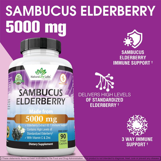 NaturaLife Labs Sambucus Elderberry Extract 5,000 mg with Vitamin C & Zinc - 90 Day Supply | Immune Support Supplement | Non-GMO Veggie Capsules