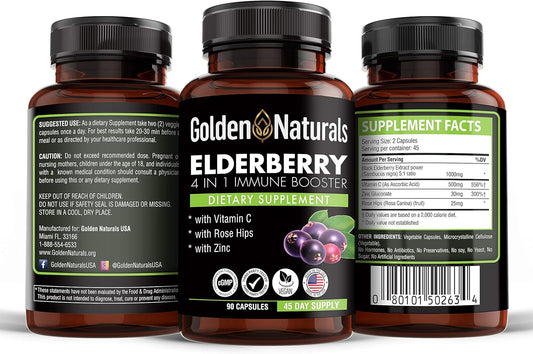Organic Black Elderberry Extract 1000mg Capsules with Vitamin C, Rose HIPS, and Zinc - Immune Booster for Powerful Support