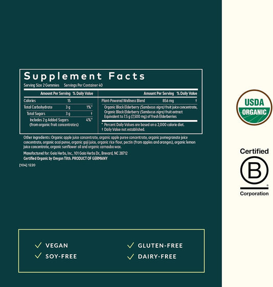 Certified Organic Black Elderberry Adult Daily Gummies for Immune Support - 80 Gummies (40-Day Supply) - Gaia Herbs