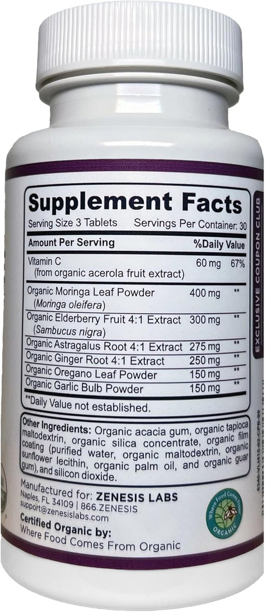 Organic Immune Support Supplement with Vitamin C, Moringa, Elderberry, Astragalus, Oregano, Ginger, Garlic - 90 Tablets
