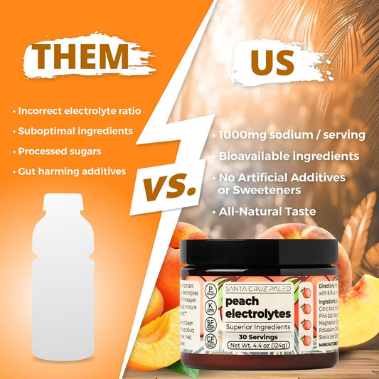 30 Servings Santa Cruz Peach Paleo Electrolyte Powder with Himalayan & Sea Salt, Magnesium, Potassium - Sugar-Free