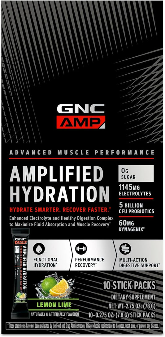 GNC AMP Amplified Hydration Electrolyte Powder Drink Mix - Lemon Lime Flavor - 10 Count Pack for Enhanced Hydration and Digestion