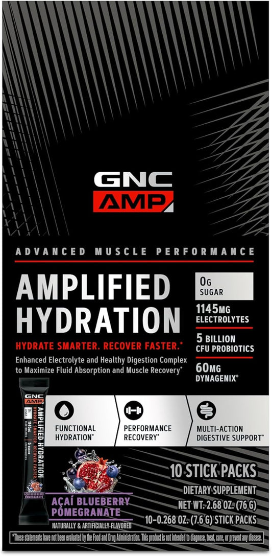 GNC AMP Electrolyte Powder Drink Mix with Enhanced Hydration and Digestion Complex - Acai Blueberry Pomegranate Flavor (10 Count)