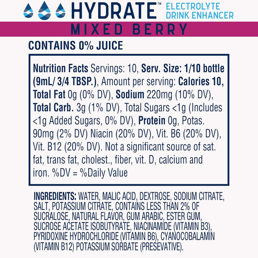 Mixed Berry Hydrate Electrolyte Liquid Drops with Essential Vitamins B3, B6, B12 - Low Sugar, Low Calorie Drink Enhancer (2 Pack)