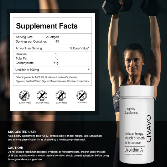 500mg Civavo Urolithin A Softgels for Muscle Strength & Endurance - 90 Count Pack - Boosts Mitochondrial Health & Energy - Clinically Proven Formula