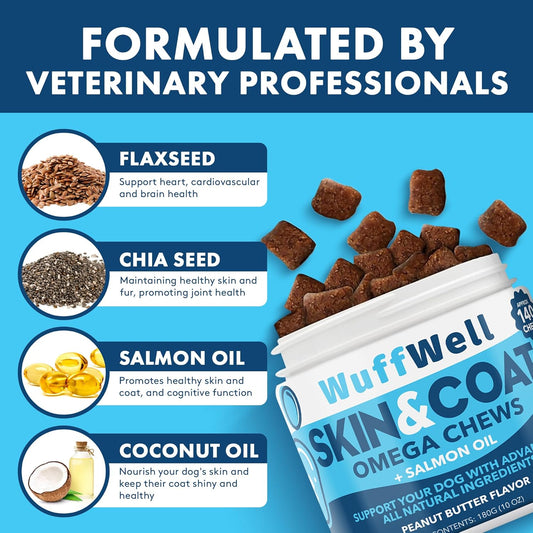 140ct WuffWell Omega 3 Salmon Oil Chews for Dogs - Skin & Coat Supplement, Allergy Relief, Anti-Shedding, Dry Skin Treatment - Made in USA