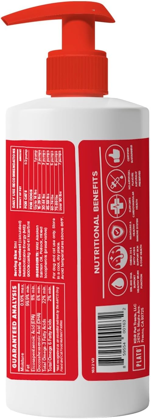 PLATO Wild Alaskan Salmon Oil Kibble Topper - Enhance Dog Food with Omega-3 & Omega-6 for Skin & Coat - 8 oz