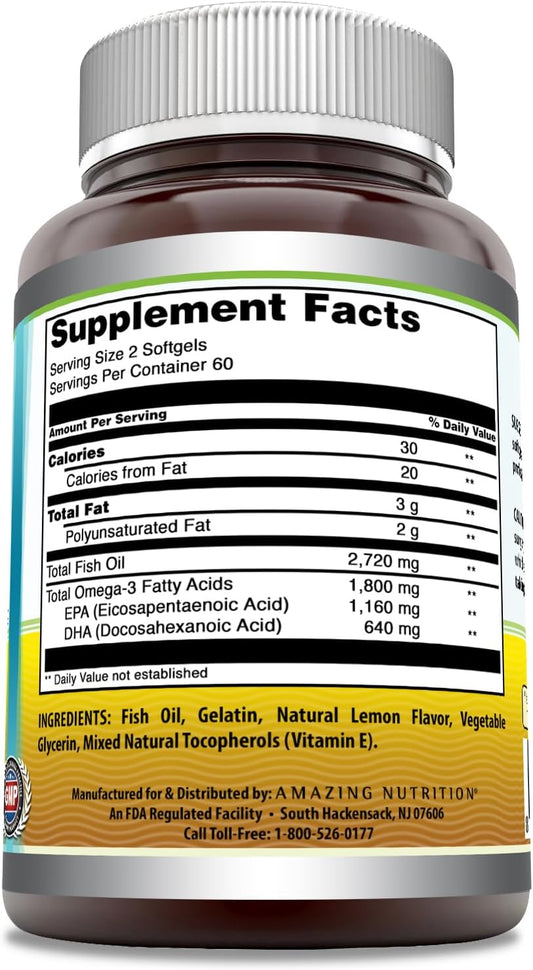 High Potency Omega-3 Fish Oil Supplement | 1360mg Per Serving | 120 Softgels | Lemon Flavor | Amazing Nutrition
