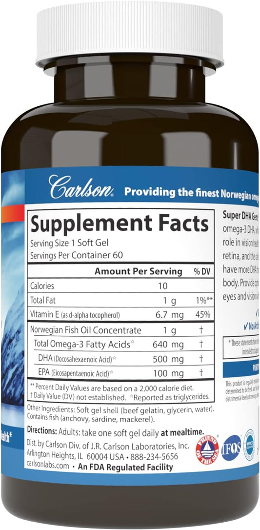 Carlson Super DHA Gems - 500mg Norwegian Fish Oil Concentrate Softgels for Cognitive Health - 60 Capsules